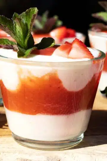 - Fruchtmus auf der Magerquark-Creme verteilen und nach Belieben mit ein paar frischen Minz-Blättern dekorieren.